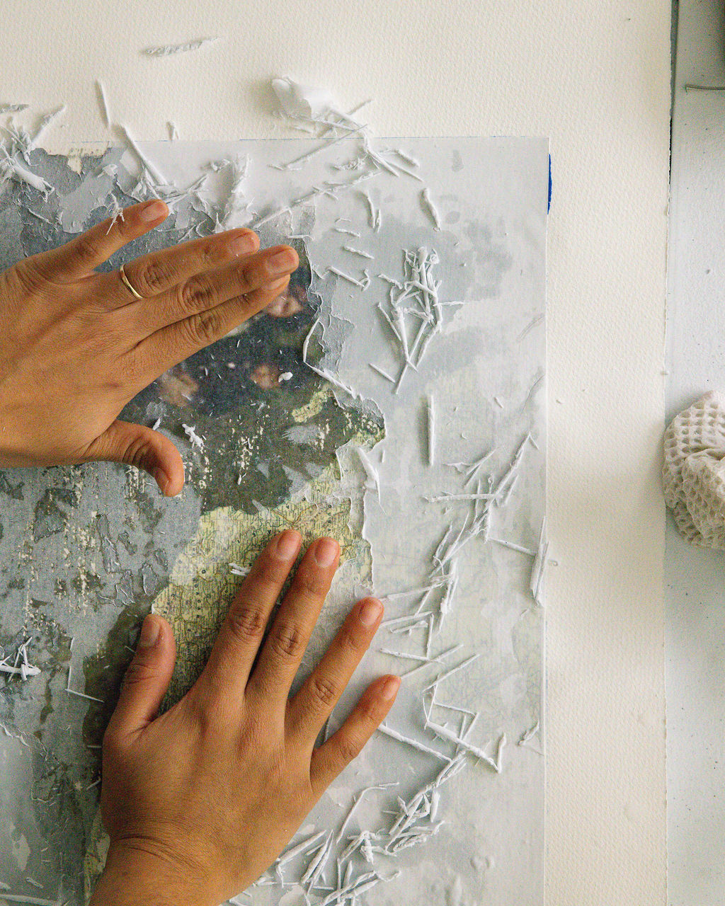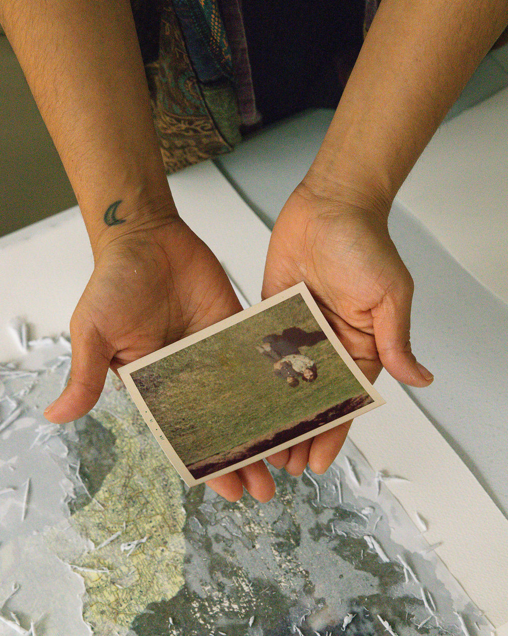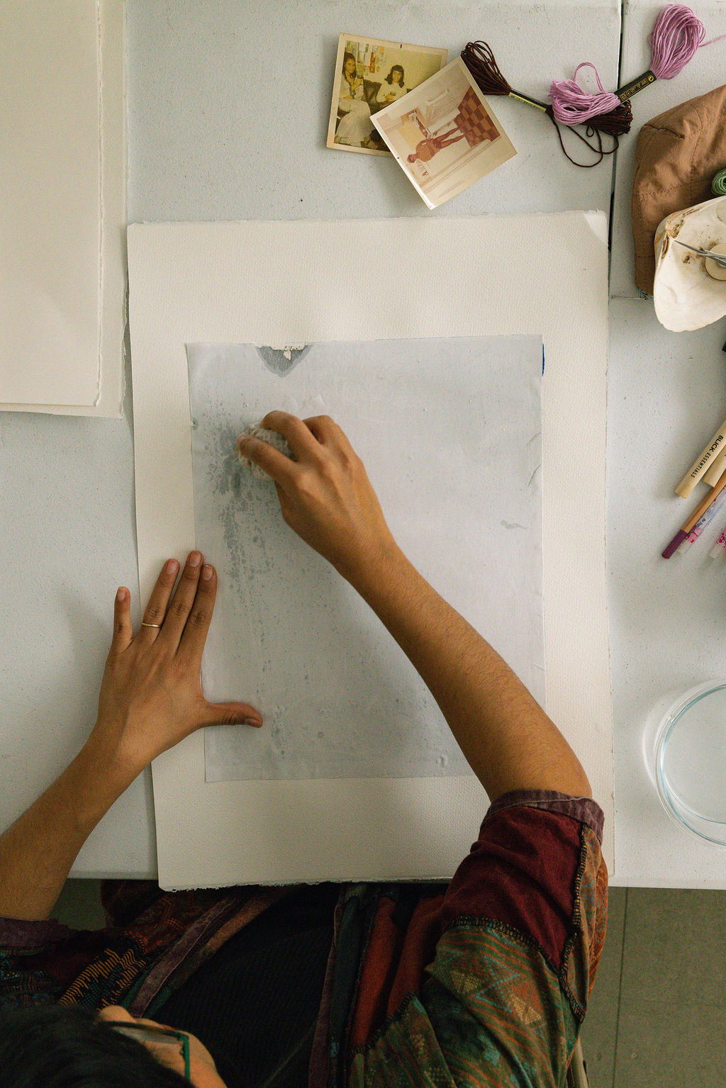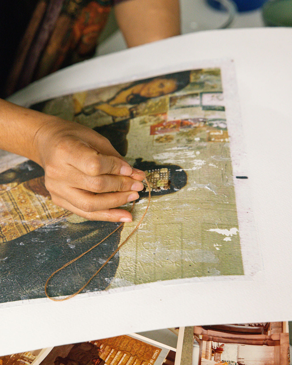 In her process, images are transferred and lifted from their original surfaces, layer by layer, revealing the fragility of what is remembered. Thread follows as a gesture of repair, marking edges, suturing fragments, and tracing new pathways through loss.